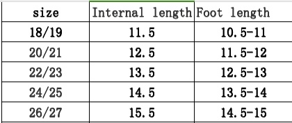Dimensions: internal length 11.5 cm18/19, internal length 12.5 cm20/21, internal length 13.5 cm22/23, internal length 14.5 cm24/25, internal length 15.5 cm26/27