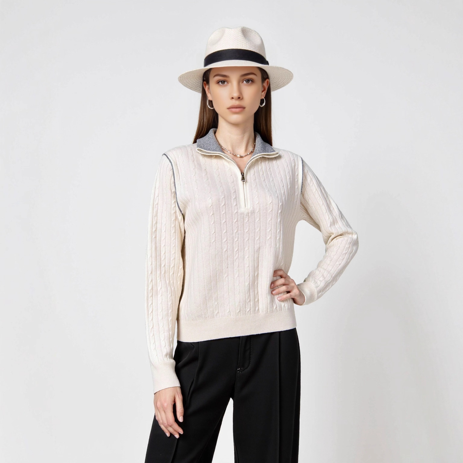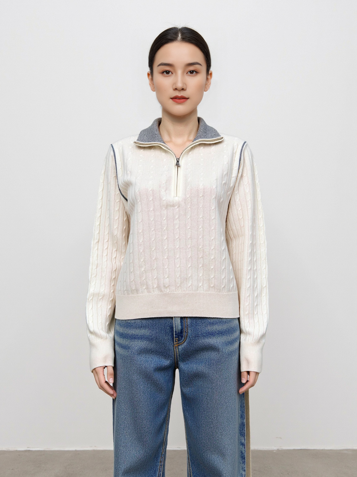 Half-Zip Turn-Down Collar Wool Sweater Women Cable Knit Wool Sweater Lazy Style Knitted Top