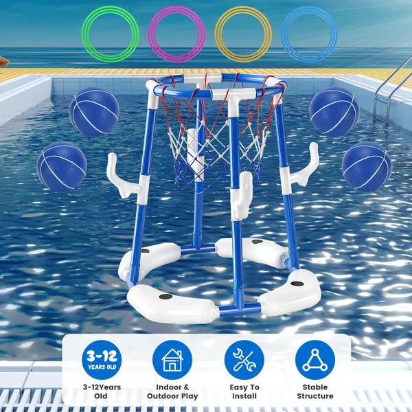 *Pool Basketball Toy Set*:Our summer pool basketball hoop toy set includes a blue/red basketball hoop,4 balls,4 circles and a convenient pump,designed to bring endless excitement and enjoyment to you and your family. Whether you’re organizing a themed pool party or just looking for ways to enjoy a sunny day,this set is an excellent addition to your summer activities.