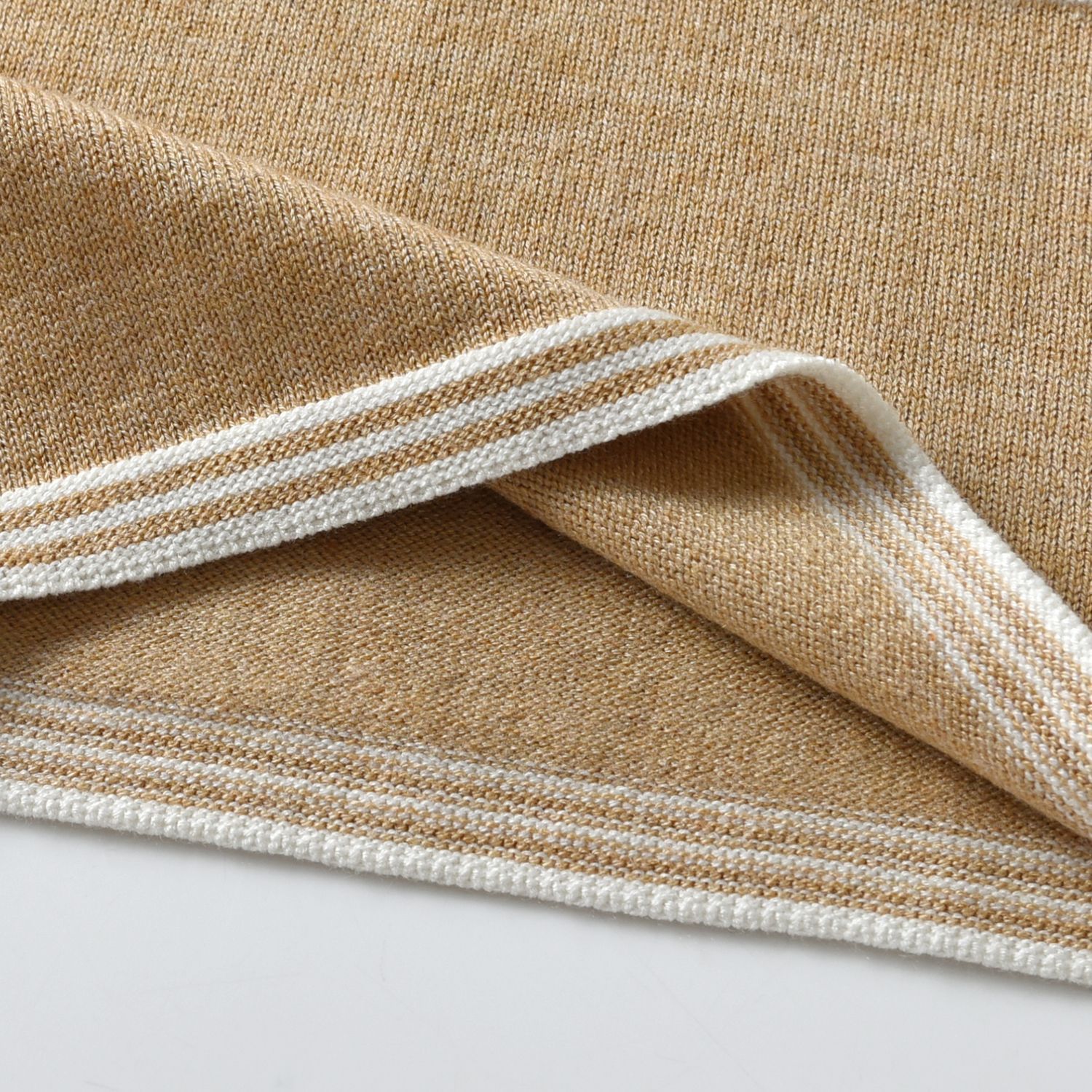 Striped sweater paired with wool trousers.
