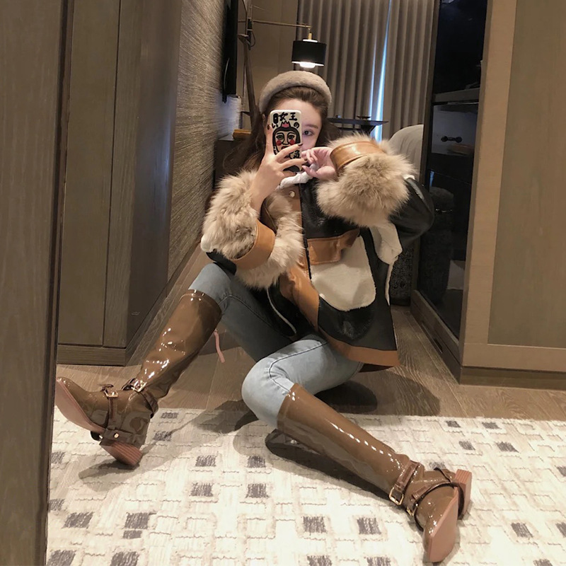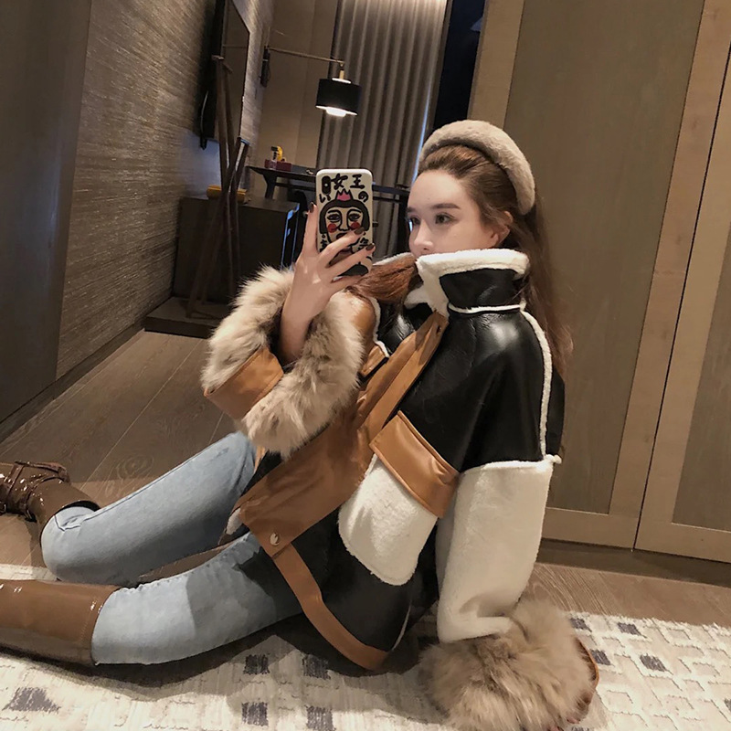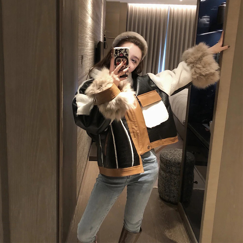 Women Leather Coat Color Matching Splicing Winter Leather Jacket Women Black